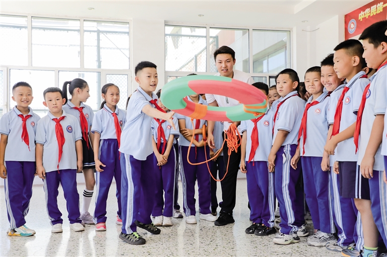 6月25日,学生们学习如何施救。暑假临近,呼和浩特市玉泉区通顺街小学开展以“珍爱生命 预防溺水”为主题的安全教育活动,学生们在内蒙古游泳救生协会志愿者的指导下学习防溺水常识、安全急救技能等,提高安全意识和自救能力。