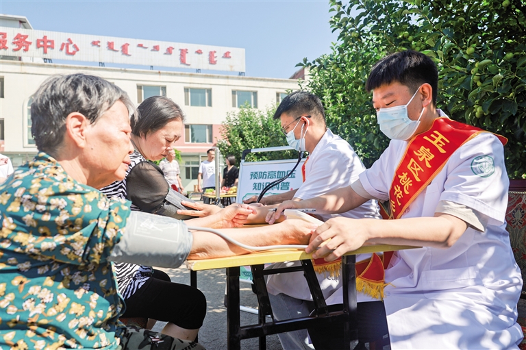 7月1日,呼和浩特市玉泉区民政局联合玉泉区桃花乡卫生院开展“情系养老院 义诊送健康”主题活动,组织医护工作者走进玉泉区敬松老年服务中心,为老年人送医送药,提供健康检查、健康随访、用药指导等贴心服务,守护老年人健康。摄影/草原云·北方新报首席记者 牛天甲