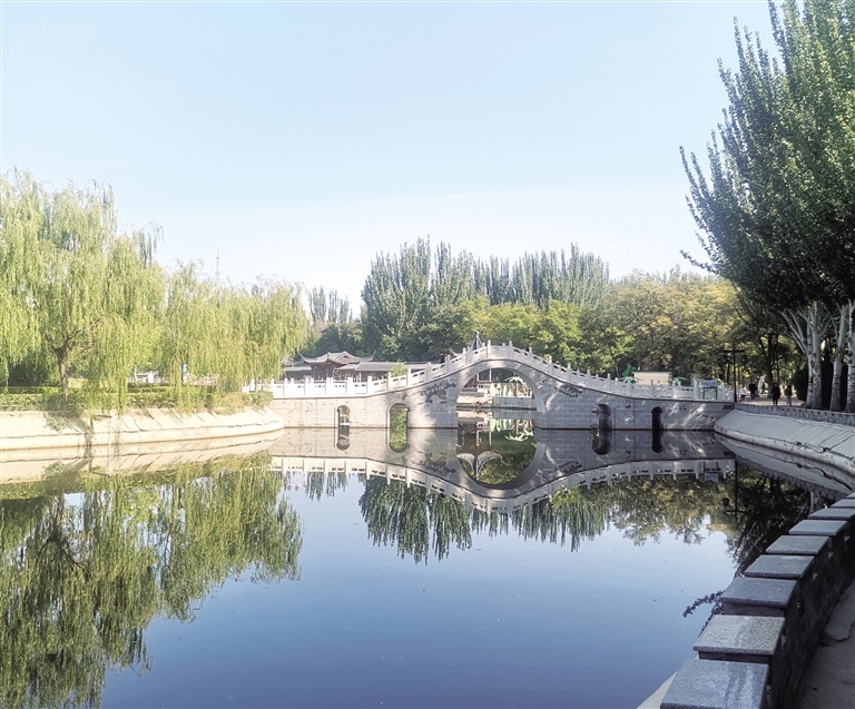 冬天雨水少,护城河就露出了河床。人们把淤泥往岸边刨,和着夏天涨水冲积的泥沙,经他们辛勤整理后,就成了块块的小土地。他们在上面种些时令蔬菜,有蒜苗、小葱、菠菜、芫荽、胡萝卜、小白菜等,品种繁多,绿油油的,长得喜人。不用施肥,过了一个夏天的河床,积下的淤泥土质肥厚。到了周末,垂钓者络绎不绝,甩竿端坐,静听水声,钓起的鱼儿都不大,基本上是些鲫鱼,颜色纯正,地道野生。有时会有白鹭漫步于河道,频频点头,寻找鱼虾。有时鱼儿翻起丝丝浪花,波光粼粼,在阳光下分外耀眼。