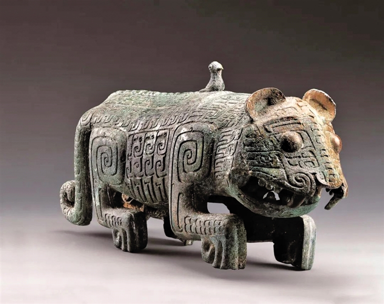 商代主题纹样为兽面纹,装饰内容趋同,但各地仍表现出鲜明的地方色彩。虎纹多在南方出现,而在江西新干县大洋洲镇,与“小鸟虎”同一遗址出土的青铜器上有50余处虎的形象或纹饰。虎的数量最多,样式最多,造型最丰。青铜鼎耳上有卧虎,足上有扁虎,青铜戈上有虎头装饰。