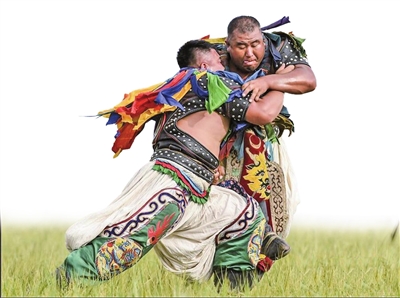 ●内蒙古有勇猛刚直的搏克手。当你看到那达慕的搏克比赛时,你可以说:
