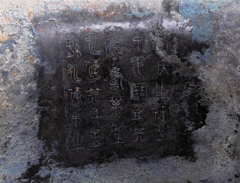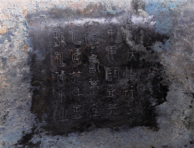 这件霸气十足的“齐侯宝盂”铜鉴其实有点“反差萌”。大盆口有四只相互对称的衔环兽耳,便于搬动,身穿鳞甲、下有四足、高昂着头、竖着耳朵、张着巨口,形状疑似为龙。“大肚”布满了两组对称的环带纹,上下间填眉形和口形纹样,中间有两条并列的弦纹,细节处处尽显霸气。但是腹内刻的5行26字铭文却字体清秀、排列整齐、笔道纤细均匀、落笔处有意弯曲,为成熟型的“玉箸体”(注释:玉箸体是一种特定的篆书风格,其名称来源于其笔画的特点,即笔画圆润如玉制的筷子“玉箸”。)是我国春秋时期难得的书法佳品。