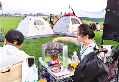 果儿是一名美术教师,性格开朗酷爱露营,在她看来,露营这种户外休闲方式,场地足够大,“打开方式”足够自由,能够更好地释放工作压力,轻松愉悦的环境还可以增进友谊。“我们往往会选择那种既有帐篷,又有美食,还有娱乐设施的露营基地,省时又省力。”果儿说道。