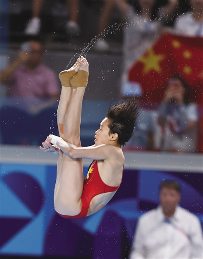 8月6日,在巴黎奥运会跳水女子10米台决赛中,这位3年前在东京奥运会上出道即巅峰的“天才少女”,在巴黎再度技惊四座。第一跳她就让全场震动,起跳、翻腾、入水,她的身体在空中如同一片羽毛般轻盈,但每一个动作又把握得精准有力。当她入水瞬间,整个场馆都屏住呼吸,“水花消失术”上演,这一跳得到90分的满分。此后全红婵守住了领先优势,最终以425.60分夺冠,成功卫冕。陈芋汐以420.70分获得亚军。得到满分对全红婵而言并不陌生,3年前在东京奥运会上,14岁的全红婵第一次出国比赛,在决赛中5次试跳,3次满分,总分466.20分,以压倒性优势夺冠,并创造了奥运会该项目的历史最高分。