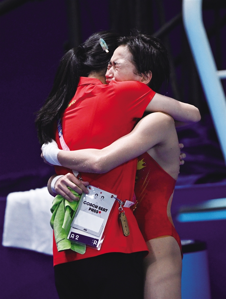 也许是和东京奥运会的惊人成绩有对比,全红婵这次只给自己打了50分。“除了第一跳,后面都还不够完美。”她说。事实上,除了第三跳稍有瑕疵外,她发挥得非常出色。夺冠后,她红着眼眶扑进教练陈若琳怀里,然后又一路小跑着去找陈芋汐,两人抱在一起。