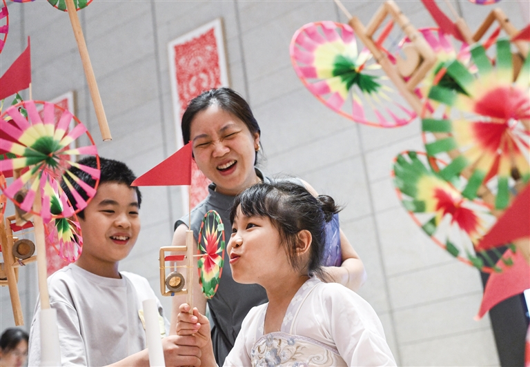 8月7日,小朋友在非遗市集上挑选风车玩具。当日立秋,位于北京的中国工艺美术馆(中国非物质文化遗产馆)推出“立秋·七夕”主题系列夜场活动。据了解,夜场活动包括非遗市集、非遗手工体验以及非遗内容展览等,活动从即日起持续到10日晚。