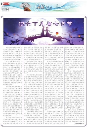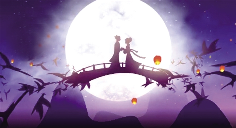后来,牛郎织女的故事不断演进发展,三国曹植《九咏》写道:“牵牛为夫,织女为妇。织女牵牛之星各处河鼓之旁,七月七日乃得一会。”那时候的七夕节,是祭祀牵牛星、织女星。直到汉代,七夕才与牛郎织女的故事联系起来,正式成为妇女的节日。东汉应劭《风俗通》载:“织女七夕当渡河,使鹊为桥。”《西京杂记》:“织女渡河,使鹊为桥,故是日人间无鹊。”“汉彩女常以七月七日穿七孔针于开襟楼,人俱习之。”南朝梁宗懔《荆楚岁时记》则记载“七月七日为牵牛织女聚会之夜。是夕,人家妇女结彩缕,穿七孔针,或以金银鍮石为针,陈瓜果于庭中以乞巧。”此时有了乞巧的说法,久而久之,七夕也成为“乞巧节”“女儿节”。