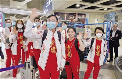 中国体育代表团成员抵达机场后向接机人群挥手致意