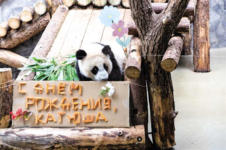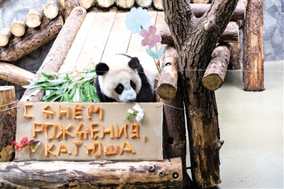 为庆祝“喀秋莎”的生日,莫斯科动物园精心准备了一个用竹叶和胡萝卜装饰的“竹蛋糕”,上面印有数字“1”,代表一周岁生日。在游客的欢呼声中,“喀秋莎”时而啃咬蛋糕上的竹子,时而翻滚在玩具堆中,憨态可掬的模样引得众人欢笑不断。(包诺敏 周天翮)