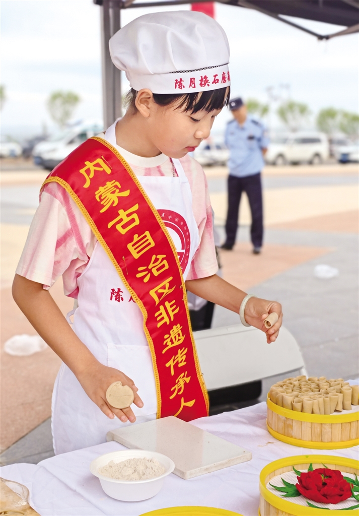 武川县是世界裸燕麦发源地之一,独特的地理环境,造就了武川“燕麦之乡”的美誉,武川莜面饮食制作技艺是自治区级非遗代表性项目。开幕式现场,武川县石磨莜面传习基地的非遗传承人来到现场,展示莜面制作技艺,让现场观众近距离感受莜面技艺的独特魅力与深厚底蕴。搓、推、擀、卷……不一会儿,一笼笼形态各异的莜面出炉,仿佛艺术品一般,吸引众多观众驻足欣赏。现场还展示了葱油莜面、莜面拌面、莜麦全粉速食面等由莜面加工而成的各类速食食品,以及武川土豆、武川荞面、武川剪纸等特色美食和技艺。