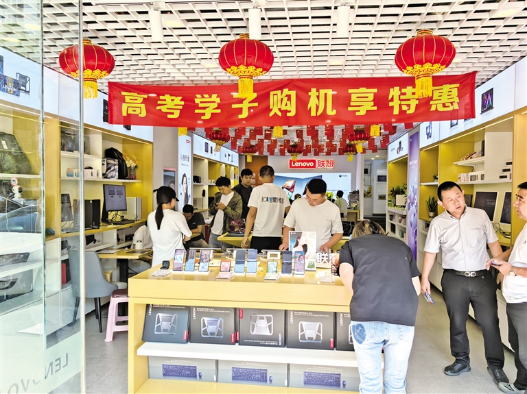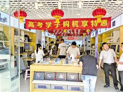 “高考学子购机享特惠”“凭学生证可以享受学生优惠”……在诚信数码大厦,多家电子产品专卖店面向大学新生推出满减、买赠等优惠活动,顾客络绎不绝,有的是家长带着孩子挑选电脑,有的是孩子结伴前来购买。