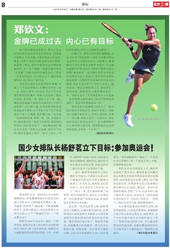 在决赛后接受国际排联专访时,杨舒茗就提到,中国是排球强国,希望能够代表中国女排参加奥运会。杨舒茗说,这个目标在她开始专业训练时就定下来了,“要想实现这样的目标,首先就是要更加刻苦地训练,希望在最短的时间内尽力提升各个方面的技术。”杨舒茗认真地说。(据《中国体育报》)