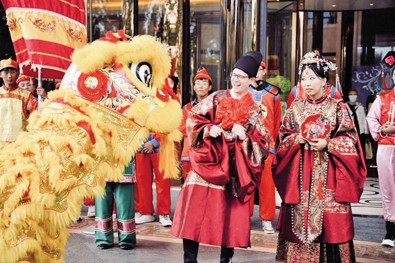 这位澳大利亚小伙名叫NathanS,新娘名叫牛梦圆,是土生土长的呼和浩特人。牛梦圆大学毕业后留学海外,目前定居澳大利亚墨尔本从事国际法律工作。留学期间,两人相识相知相爱,并于2023年年底在墨尔本登记结婚,举行了西式婚礼,此次是特地回到呼和浩特娘家举办隆重而热闹的中式婚礼。两人当天穿着喜庆的宋制婚服,国外的亲朋好友也都穿着传统中式服装现场见证这一幸福时刻。从接亲、却扇、与父母依依不舍告别、坐上轿子,到缓缓走上舞台,共饮合卺酒,婚礼中的每一个细节都还原了宋制婚礼的场景,仪式感十足,唯美浪漫的氛围也感动了无数亲友。
