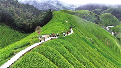 9月9日,游客在龙脊梯田景区游览。一场秋雨过后,广西壮族自治区龙胜各族自治县龙脊梯田云雾缭绕,云海、梯田、吊脚楼构成一幅幅美丽的田园画卷。 (据新华社报道)