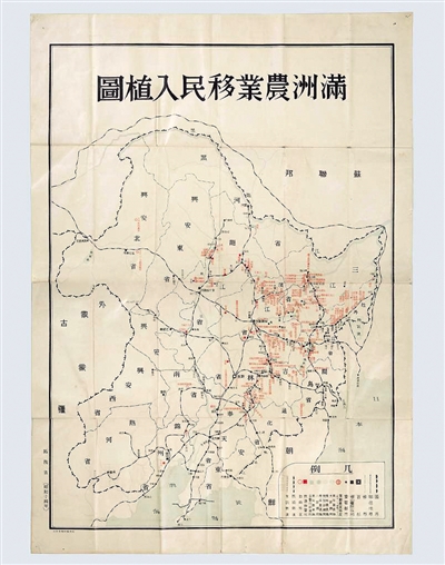 据介绍,1939年“满洲农业移民入植图”是日本昭和14年(1939年)由日本拓务省出版,日本杉田屋印刷所印刷,用100克凸版纸,呈红、黑、浅蓝三色,纵76厘米,横54厘米,保存完好。这是在1996年4月哈尔滨举行的近现代文物征集活动中,由民间人士捐赠,为东北烈士纪念馆收藏。
