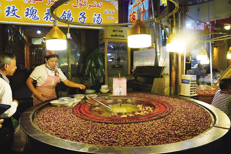 9月19日晚,在喀什古城景区,一名游客购买特色小吃“玫瑰花鸽子汤”。新疆喀什古城作为古丝绸之路的重要节点,拥有着丰富的历史文化遗存。近年来,喀什古城不断完善旅游业态布局,让体验式消费逐渐成为景区引流留客的重要方式。2021年,喀什古城入选“第一批国家级夜间文化和旅游消费集聚区”。