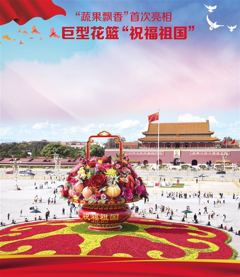 “祝福祖国”巨型花篮顶高18米,以喜庆的蔬果花篮为主景,篮内除传统的牡丹花、月季花等花卉外,首次选取了分别寓意福禄吉祥、喜庆丰收、红红火火的葫芦、南瓜、辣椒等蔬果,体现“蔬果飘香、繁花似锦”。篮体南侧书写“祝福祖国”“1949-2024”字样,篮体北侧书写“普天同庆”“1949-2024”字样。花坛底部直径45米,为如意图案,寓意吉祥如意、国泰民安。