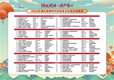 国庆节假期,呼和浩特文旅部门从主题定位上,聚焦庆祝中华人民共和国成立75周年、打造“一廊两轴三带”、打造北疆文化品牌、建设博物馆之城等文旅中心工作。从内容策划上,聚焦塞上老街旅游休闲街区、中山路商圈、敕勒川草原等旅游景区网红打卡地等,推出五大主题活动,包括“乐燃青城”街景音乐会、“北疆风华”沉浸式音乐会、“武川望夏”沉浸式演艺等。从活动布局上,聚焦游客出游需求,设置东(敕勒川草原)、南(大黑河沿线)、西(塞上老街旅游休闲街区)、北(莫尼山非遗小镇)4个活动主场,打造15分钟文旅活动圈。从惠民消费上,聚焦文旅商体建设体系,激发市场活力、拉动文旅消费。快和你的小伙伴约起来吧!