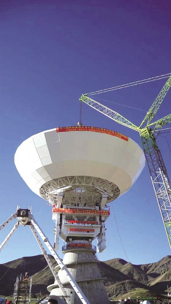 这是探月工程四期投资建设的一架射电望远镜,与今年8月在吉林长白山完成天线系统主反射体吊装的射电望远镜一起加入中国VLBI(甚长基线干涉测量)网,构成灵活的六站一中心“双子网”,具备同时观测两个不同天区的月球与深空探测器定轨能力。今年4月,中电39所工程人员、基建工程队和上海天文台工作人员入驻日喀则4100米海拔高原现场,通过6个月艰苦努力,7日上午顺利完成主反射体吊装。