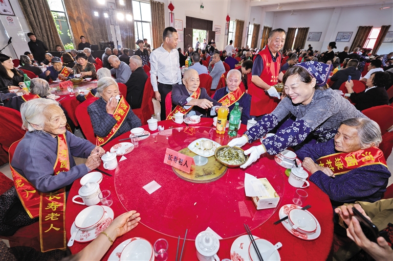 10月9日,在河西埭村“孝心村宴”活动现场,村嫂志愿者给老人端上长寿面。当日,浙江省杭州市临平区文化特派员走亲启动仪式暨塘栖镇河西埭村迎重阳孝心节“孝心村宴”活动在河西埭村文化礼堂举行。村里200多位70周岁以上的老人齐聚一堂,活动现场还有志愿者提供义务理发、量血压等便民服务。