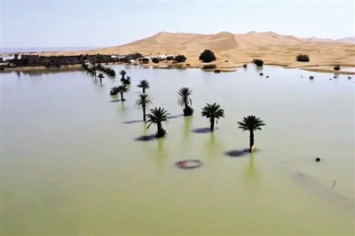 暴雨过后,部分沙漠地区可见水从沙中涌出。美国国家航空航天局的卫星图像显示,大量水涌入已经干涸50年的伊里基湖。在邻国阿尔及利亚,迈拉赫盐沼也难得地被雨水填满。