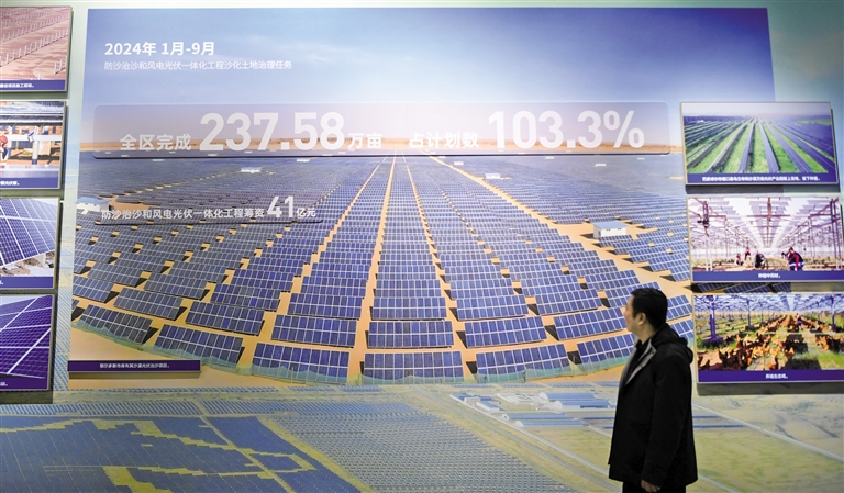 10月28日,由内蒙古自治区党委宣传部、自治区林业和草原局主办的“绿色长城 生态奇迹”——内蒙古防沙治沙和“三北”工程攻坚战主题展在内蒙古展览馆开展。本次主题展分为“牵挂‘三北’殷殷嘱托”“不负重托 挺膺担当”“鏖战‘三北’绿润北疆”“科学治理 守正创新”“‘三北’精神 赓续传承”五部分,共展出169幅图片、59幅文字版、61幅图表图例、110件实物展品、12组数字多媒体内容。此次展览集中展示40年来内蒙古防沙治沙和“三北”工程建设取得的巨大成就,特别是“三北”工程攻坚战和三大标志性战役启动以来的总体进展、重要战果、先进典型等。摄影/草原云·北方新报首席记者 牛天甲