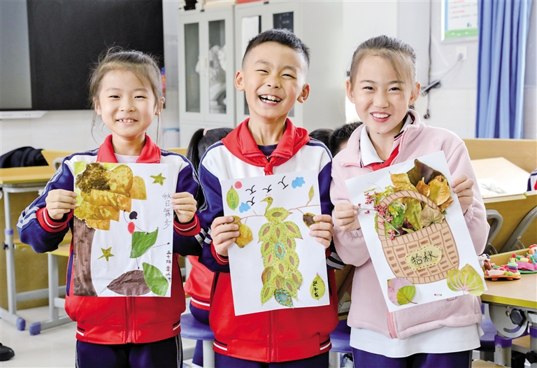10月30日,呼和浩特市玉泉区石东路小学学生展示自己制作的创意树叶画。当日,该校开展“创意树叶画 留住秋天美”主题教育活动,老师带领学生们将采集来的落叶进行绘画、修剪、拼装、粘贴,制作成一幅幅充满大自然气息的树叶画,在留住秋天美景的同时,也锻炼了学生们的动手能力和想象力。摄影/草原云·北方新报首席记者 牛天甲