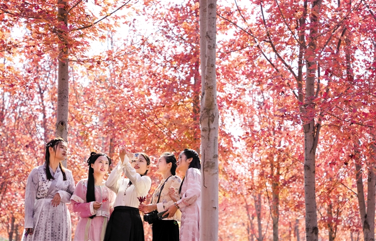 11月5日,在山东省新泰市青云街道,人们在枫树林里游览。近日,位于山东省新泰市青云街道的枫树林,枫叶大面积变红,色彩亮丽,吸引不少市民前来观赏。摄影/新华社记者 徐速绘