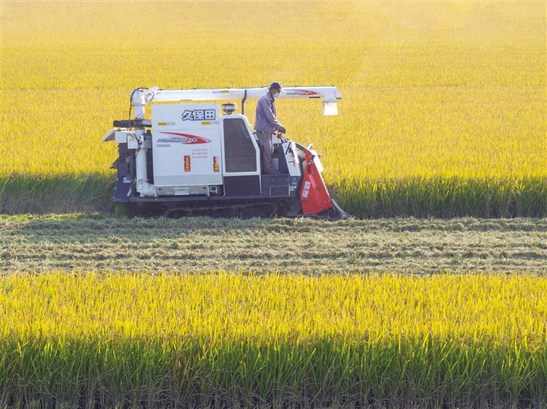 11月11日,农民驾驶农机在江苏省兴化市陈堡镇唐庄村田间收割晚稻(无人机照片)。初冬时节,我国部分地区的晚稻陆续成熟,田间地头一派繁忙收获景象。(据新华社报道)