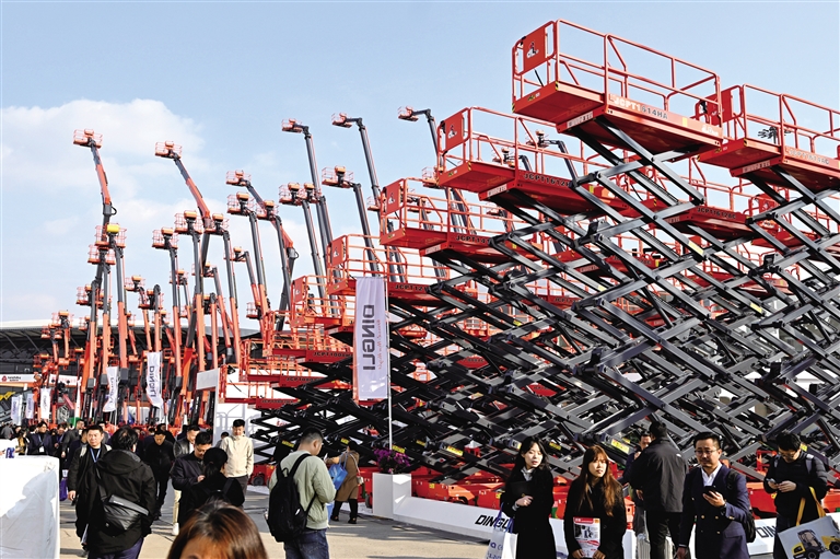 11月26日,参展者从浙江鼎力展区旁走过。11月26日至29日,上海国际工程机械、建材机械、矿山机械、工程车辆及设备博览会在上海新国际博览中心举行。中联重科、浙江鼎力、卡特彼勒等国内外知名机械企业携硬核机械产品亮相。(据新华社报道)