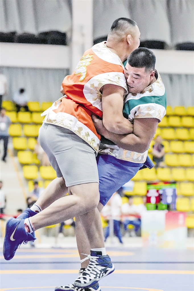 11月27日,内蒙古队选手温都苏(右)与内蒙古队选手查干扎那在且里西87公斤以上级决赛中,温都苏最终获胜。当日,第十二届全国少数民族传统体育运动会民族式摔跤且里西决赛在海南省三亚市举行。