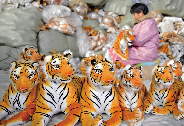 11月26日,河南省商丘市夏邑县韩道口镇一家工艺品厂,村民在制作仿真布老虎。连日来,各大企业开足马力抓生产、赶订单,冲刺四季度。 (据新华社报道)