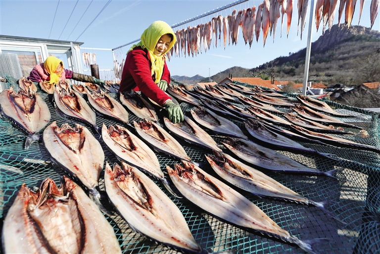 12月3日,青岛市即墨区鳌山卫街道垛石村的渔民在晾晒鱼干。初冬时节,山东省青岛市即墨区沿海一带的渔民趁天气晴好,将捕获的海鱼经过切割、腌制、晾晒等工序加工成鱼干,通过线上线下途径销售,增收创收。(据新华社报道)