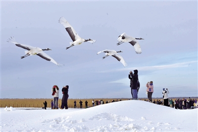 12月22日,游客在黑龙江扎龙国家级自然保护区观赏丹顶鹤。冬日时节,众多游客来到位于齐齐哈尔市的黑龙江扎龙国家级自然保护区,在皑皑白雪中观赏人工繁育的丹顶鹤。 (据新华社报道)