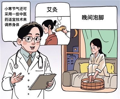 小寒节气还可采用一些中医药适宜技术来调养身体。湖南省中西医结合医院副院长肖长江提醒,小寒是养肾的好时机,艾灸大椎、足三里和关元等穴位有一定的温补肾阳功效,可增强人体免疫力;睡眠不好的人可尝试晚间泡脚15分钟左右,这样有助于驱寒和促进血液循环,可在一定程度上改善睡眠质量。