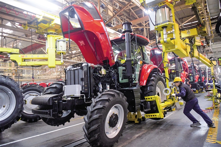 工人在河南省洛阳市一家拖拉机生产企业车间工作