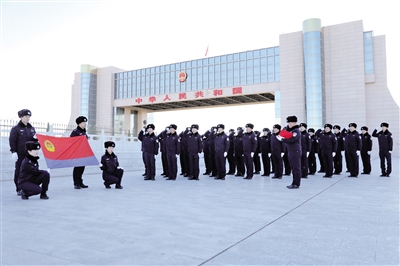 为庆祝即将到来的第五个中国人民警察节,引导初任民警系好从警“第一粒扣子”,迈好从警“第一步”,呼和浩特铁路公安处在二连浩特市举办“筑牢忠诚警魂 锻造公安铁军”初任民警爱国主义教育主题活动。在庄严神圣的国门前,32名初任民警整齐站立,面对警徽,高举右拳,誓言铮铮。他们在横幅上签字,许下“对党忠诚 服务人民 执法公正 纪律严明”的誓言。