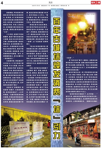 在“凯利空间”餐厅二楼露台,消费者林燕燕和朋友们不停拍照。望着马路对面霓虹灯映照下的古城墙,她难掩兴奋:“我从小就在城墙边长大,这里的变化太大了。古朴的城墙和时髦的商街相映成趣。”