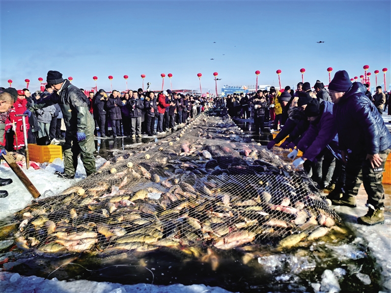 开幕式现场精彩纷呈。《五彩渔梦哈素海》情景剧以其独特的艺术魅力,生动展现哈素海冬捕的悠久历史和渔猎文化。随后,冬捕起网环节更是将活动推向高潮。其中,头鱼以68万元成功拍卖,寓意着丰收与吉祥。同时,冰上娱乐、集装箱市集、星空露营、主题生活馆等项目也同步开放,为游客们提供丰富多彩的体验选择。