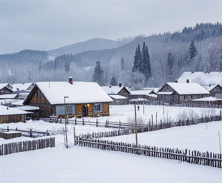隔牖风惊竹,开门雪满山。恰如昨夜梦里一样,大地白茫茫一片,从地坝、柴火垛、房顶、竹林开始,一直铺向田野、山坡,直到目光尽头的山岭,然后与那里浅灰色的天空衔接,沿着起伏的山峦划出一条若隐若现的波浪线。当然,雪花依然给村庄留下了一些空间,免得将大地涂抹成一张白纸。高低错落的土墙房子,墙壁是褐红色的土墙,屋顶铺着一层厚厚的白雪,远远望去红白相间,层层叠叠,倒颇有层次感,勾勒出了一幅素默孤寂的淡雅画卷。家家户户的烟囱里冒出袅袅的青烟,这烟却不是扶摇直上,而是被风吹得四处飘散,氤氲在村庄的上空和四周,于是整个村庄就似雾似纱,显得朦胧起来。