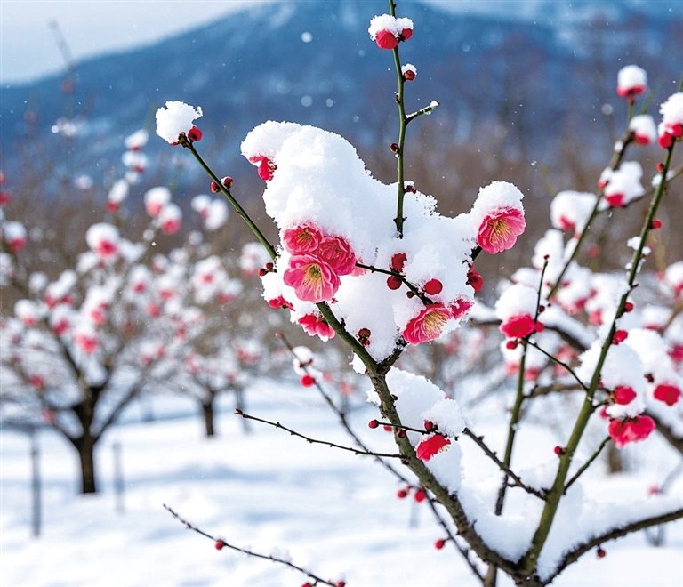 隆冬之际,万物寂静,但还是会有一些花不畏严寒,独自绽放,给萧瑟的冬天带来一缕亮色和春意。就像那“墙角数枝梅,凌寒独自开”的梅花。梅花作为“花中四君子”之首,自古以来就是文人墨客竞相题咏的对象,他们以梅为引,挥洒笔墨,在诗画间抒发对高尚品格与不屈气节的追求。“闻道梅花坼晓风,雪堆遍满四山中。何方可化身千亿,一树梅前一放翁?”“冰雪林中著此身,不同桃李混芳尘。忽然一夜清香发,散作乾坤万里春。”“梅雪争春末肯降,骚人阁笔费评章。梅须逊雪三分白,雪却输梅一段香。”“孤高来处自天人,末上常先万物新。不有大寒风气势,难开小朵玉精神。冰溪影斗斜斜月,粉镜妆成澹澹春。直伴东风到青子,多情不逐雪成尘。”
