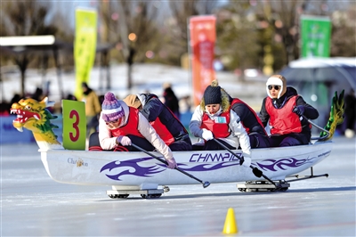 1月20日,锡林郭勒国际冰上龙舟锦标赛在内蒙古锡林郭勒盟锡林浩特市锡林湖冰场开赛,选手们拼尽全力,奋勇争先。比赛为期两天,设直道赛、漂移折返赛等项目,来自中国、美国、俄罗斯、英国、意大利、德国、新加坡、菲律宾等国家的20支参赛队伍,近400名冰上龙舟运动爱好者参加比赛,喜迎中国农历新年到来。摄影/王 正
