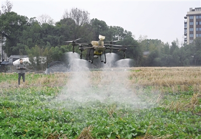 2月3日,浙江省金华市武义县东干村种粮大户朱美良操控植保无人机,对规模种植的油菜喷施叶面肥。