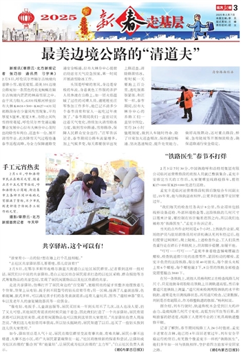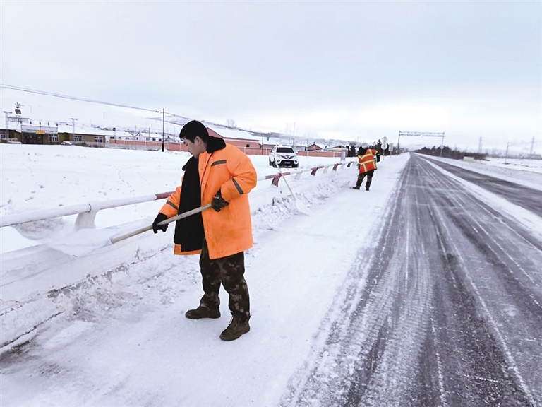 头顶是呼啸的寒风,身边是穿梭的车流。身着黄色工作服的养护人员奔波在公路上,如一团火焰温暖了过往的司乘人员。道班班长汪军参加工作多年,他已记不清多少个春节没有和家人一起吃过年夜饭了。“春节期间我们一直密切关注着天气变化,持续加大清雪除冰力度,做到雪中路通,雪停路净,保障人民群众安全出行。”汪军告诉记者,春节期间公路车流量增多,加上气候多变,每天都要很早出发上路巡查,清除路面结冰,有时候一天要跑上百公里,连吃饭都很紧张。和汪军一样,春节期间,拉布大林分中心的养路工们一直坚守岗位,实行24小时值班制度,做到人车随时待命。除了日常加大巡查频次、保持通信畅通、坚决迅速响应、提升处突能力、做好高效联动,还对重点路段、桥梁、急弯陡坡等开展细致检查,确保道路通行安全稳定。