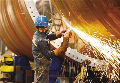 2月5日,江苏省连云港经济技术开发区一家风力设备公司工人在车间内生产风电塔架。