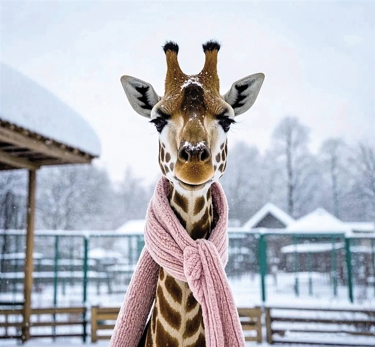 长颈鹿修长的脖颈围着一条柔软的羊绒围巾,优雅尽显。
