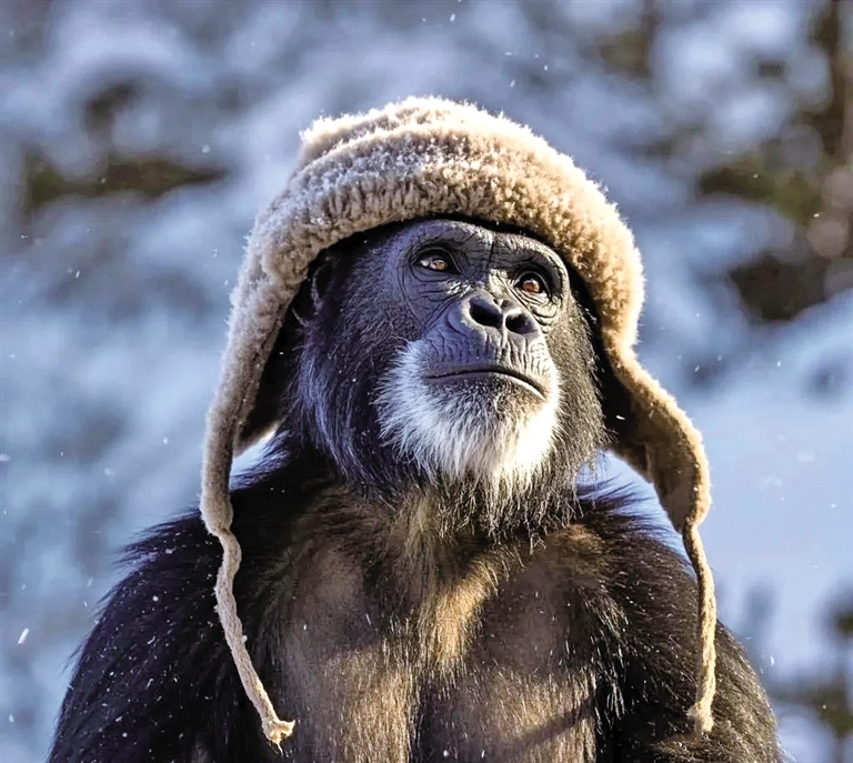 猩猩头戴一顶羊绒帽,仿佛有了“思想深度”。