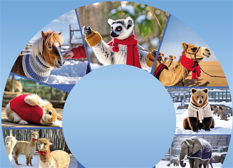 环尾狐猴戴上羊绒围巾和腕套,活泼又机灵的模样,让人不爱都难。 小矮马套上羊绒脖套,优雅地在雪地漫步。 活泼可爱的兔子穿上羊绒衫,毛茸茸的装扮让它愈发灵动俏皮。 呆萌的羊驼系着羊绒领结,憨态可掬。 最引人注目的是大象,庞大的身躯披着一件羊绒披风,显得气度不凡。 棕熊披上羊绒披肩,多了几分精致与温暖。 骆驼围着羊绒围巾昂首挺胸,新年的装扮为它增添了一份别样的风采。