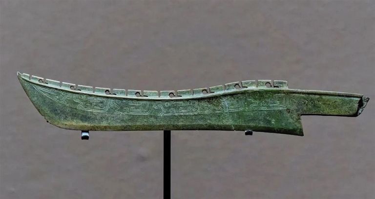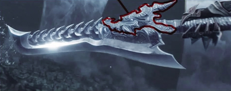 此刀名为“龙牙刀”,其设计融合了两种不同的武器元素。前半部分参考了商朝时期的青铜刀,刀尖上挑、刀背附齿、刀腹略收,正是商朝青铜刀的典型特征。