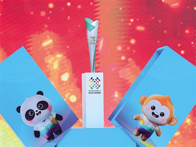 火炬纹饰设计也是别具匠心:会徽居中醒目,成都世运会吉祥物蜀宝、锦仔灵动跃然其上;出火口灵感来源于金沙遗址铜立人像太阳冠,底部则以三星堆凤鸟纹托举火炬,将古蜀文明与现代体育精神完美融合,也向世界讲述着“缘”起天府的动人故事。
